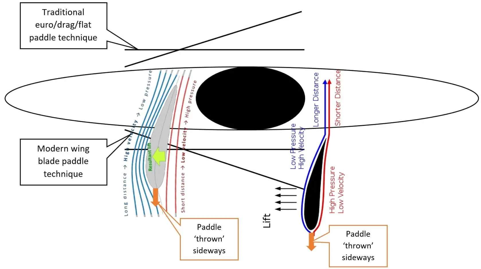 Putting the wing paddle blade in the water and pulling it straight backwards (parallel with the kayak), you’re simply pulling a spoon-shaped wing paddle blade through the water. A wing paddle blade should not soley move backwards during the stroke, making it more efficient. Using the airfoil section of a wing paddle blade thrown sideways makes use of the Bernoulli effect to generate ‘lift’ on the front of the paddle blade; driving you forwards and faster.